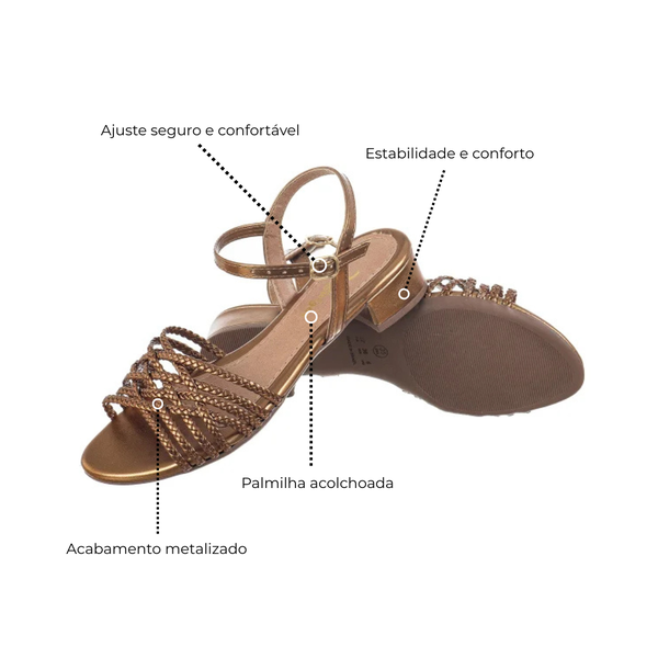 "Sandália feminina com salto bloco baixo e médio, confortável e moderna, com tiras traçadas. A escolha perfeita para quem busca estilo e praticidade no dia a dia."
